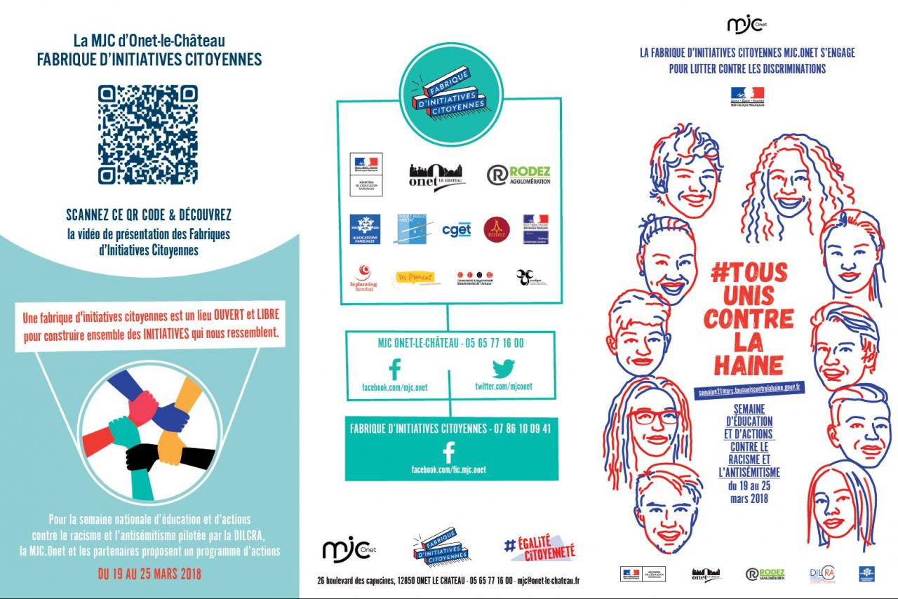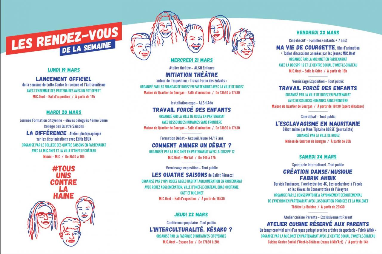 Du 19 au 26 mars 2018, dans le cadre de la semaine d'éducation et d'actions contre le racisme et l'antisémitisme, nous nous associons à la MJC d'Onet-le-Château - Fabrique d'initiatives citoyennes et à d'autres partenaires et nous vous invitons à participer aux différentes activités.