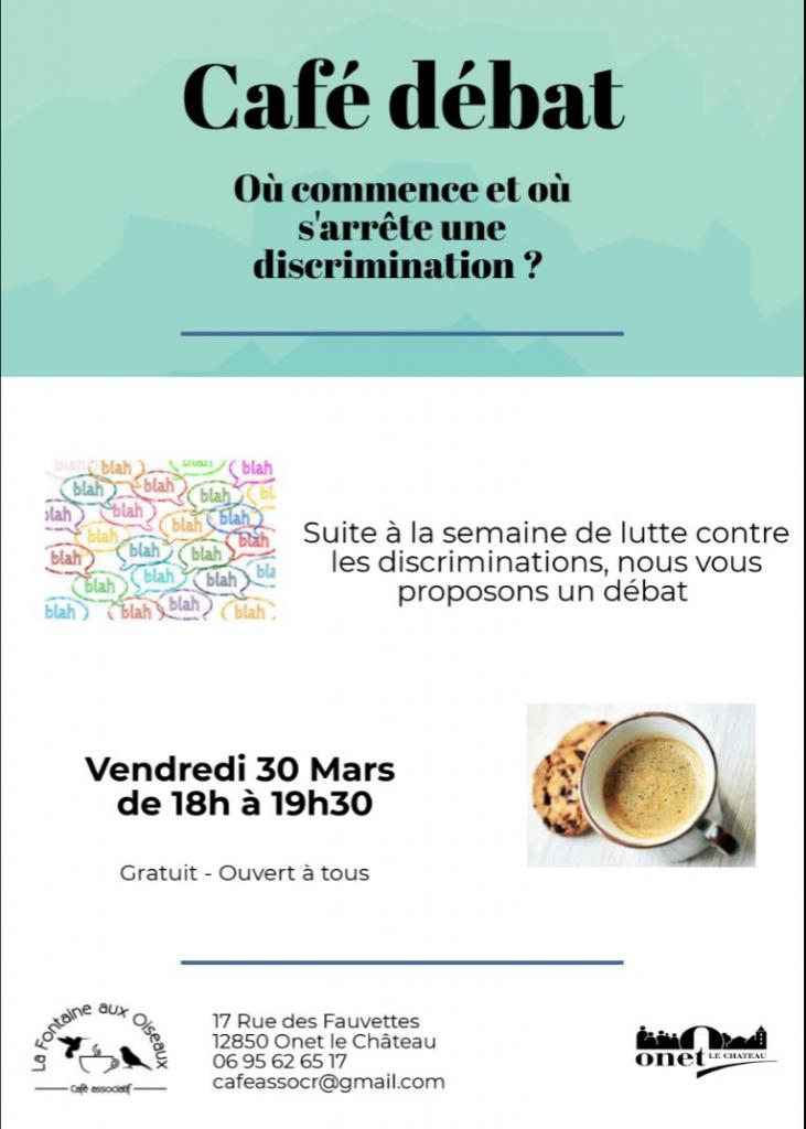 - vendredi 30 mars, à partir de 18h à la Fontaine aux Oiseaux (café associatif des Costes Rouges) pour un Café débat sur le thème "Où commence et où s'arrête une discrimination ?"